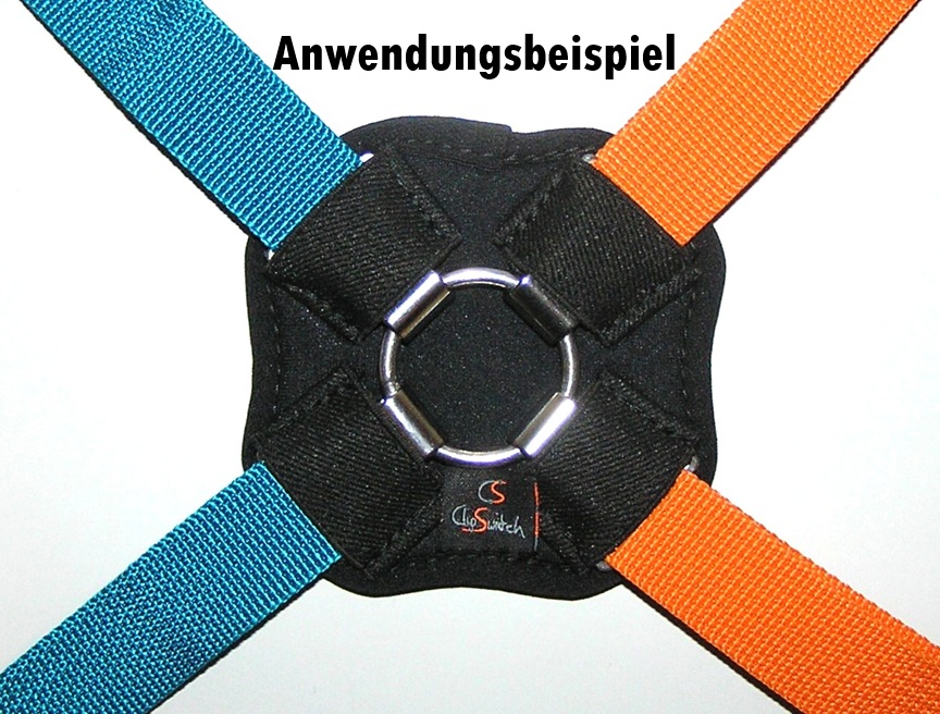 • mit 4 Gummischlaufen zur Befestigung an einer lösbaren X- oder Kreuzverbindung an Gurtsystemen bspw. an einem CS-Koppelpunkt eines Hundegeschirrs oder eines Trommelgurtes