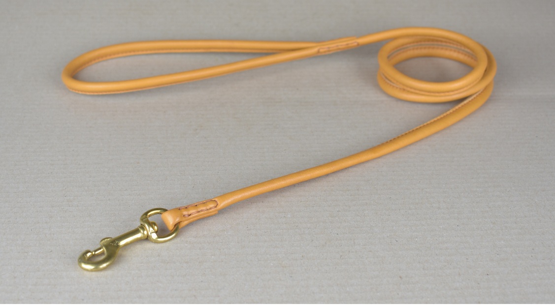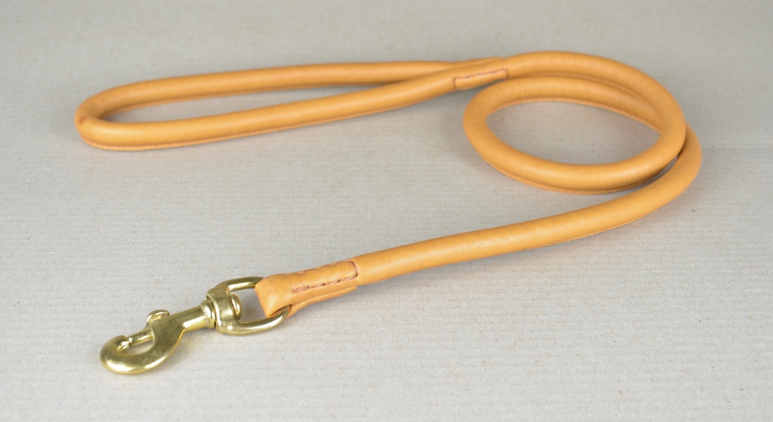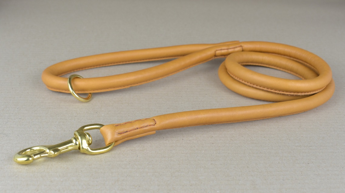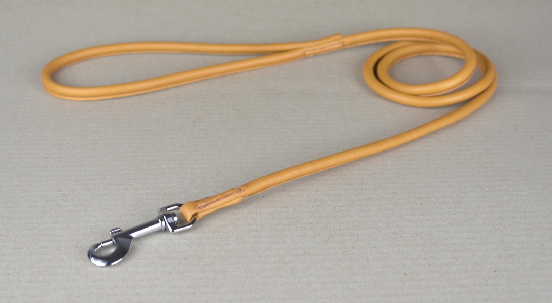 Lederleine, rundgenäht | mit Handschlaufe | cognac-farben | Kalbsnappaleder | in verschiedenen Längen | mit 8 & 12 mm Durchmesser | Karabinerhaken verchromt oder aus Messing