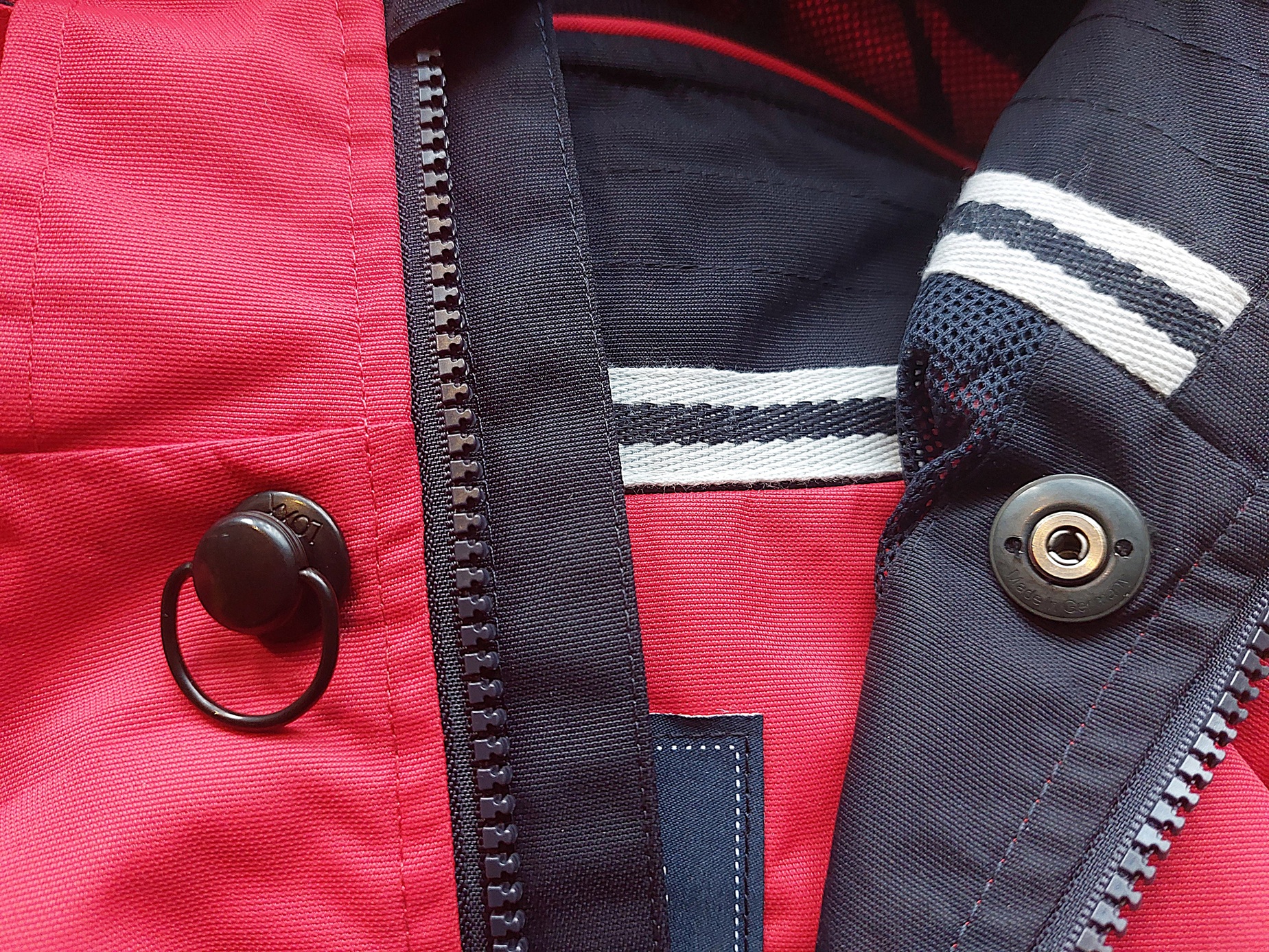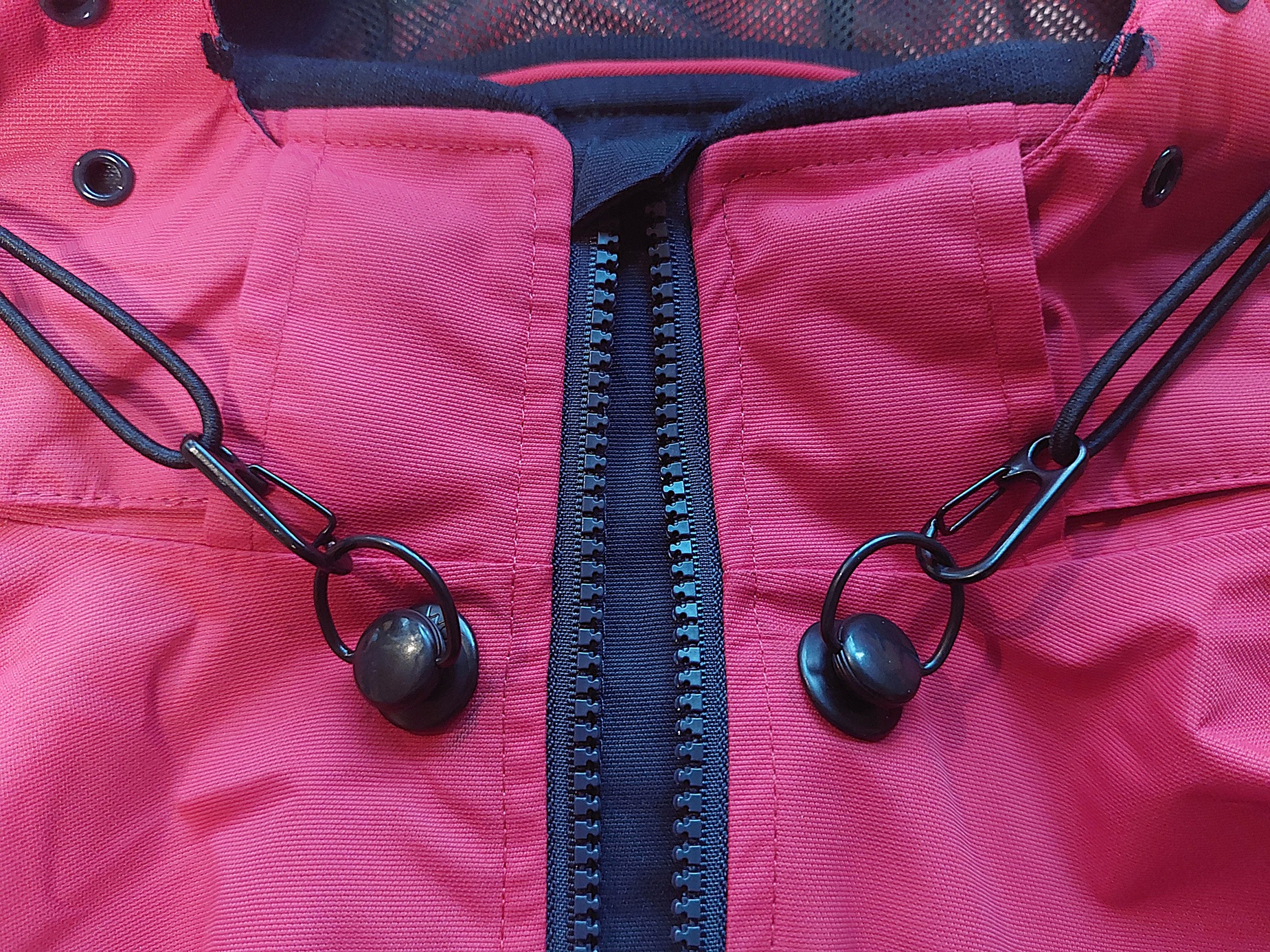 besteht in der vorderen Zugbandbefestigung unterhalb des Jackenkragens.