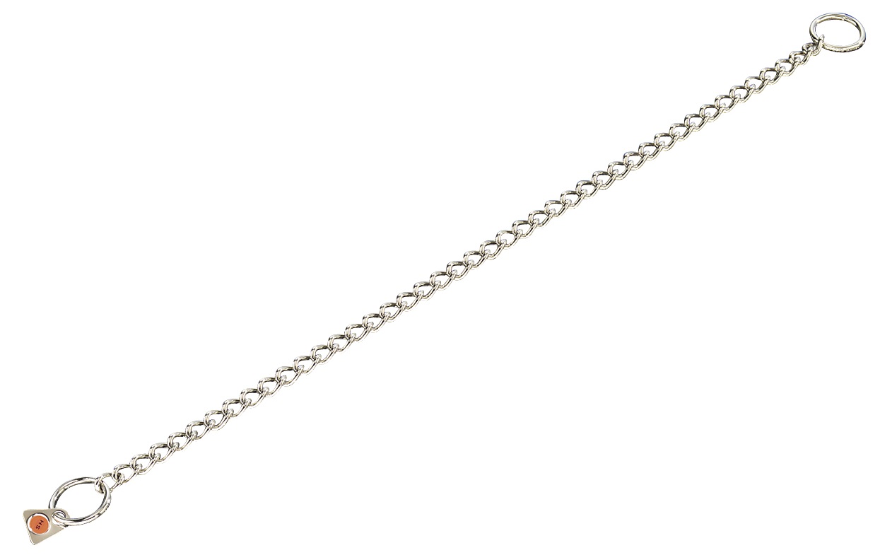Durch die Schlaufenbildung kommt es an den Endringen zu einem ‚Längenverlust‘. Daher sollten 3cm (bei einem 2,5mm starken Kettenhalsband) zur Größenermittlung der richtigen Kettenlänge zum Kopfumfang Deines Hundes hinzu addiert werden.